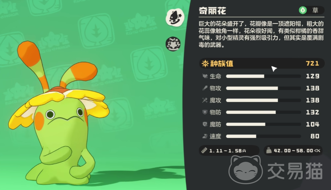 奇丽花的总种族值高达721,其中生命值为129,物攻与魔攻均为138,物防为132,魔防为104,速度为80。作为草属性代表精灵之一,它在输出与耐久方面均有出色表现,适合担任队伍中的核心输出兼半肉角色。