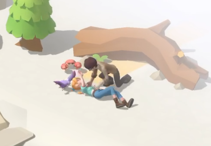 在前往救援的路上,可以留意周围的环境,例如地面上散落的树枝等资源,都可以进行采集。收集两段树木后,便可抵达求救信号发出的位置,发现受伤的角色唐恩。通过他背后所挂的标识牌,玩家可以得知当前所在区域为珍珠岛。为了救治伤者,下一步任务是寻找可用于治疗的药草或其他恢复类物品。