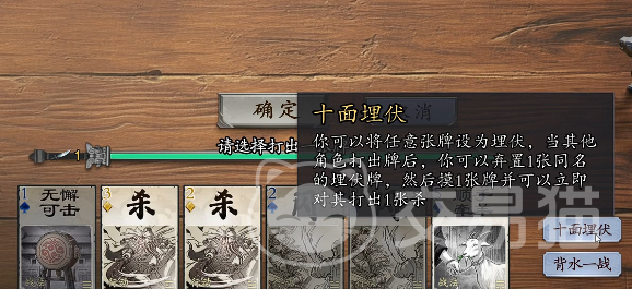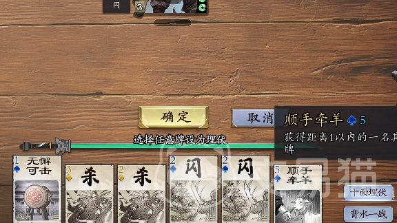 “十面埋伏”的效果会强制项羽弃掉所有“闪”牌,使其失去关键的闪避手段。此时其防御能力大幅下降,玩家可连续使用“杀”进行压制,逐步将其血量削减至2点。