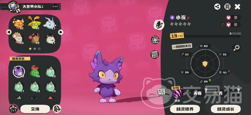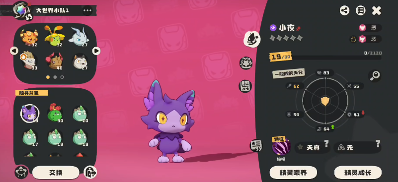 当等级达到26级后,小夜将进化为紫夜,此时种族值提升至429,速度属性显著增强。进化后的外形更加灵动,头戴帽子,整体气质更显机敏与狡黠。延续了伪装特性,行动敏捷,能在战斗中以高速翻滚躲避敌方技能,几乎难以被锁定。为了强化自身的吞噬之力,它常独自游走于各处,依靠吸收恐惧与悲伤情绪来积累能量,习惯独居生活。