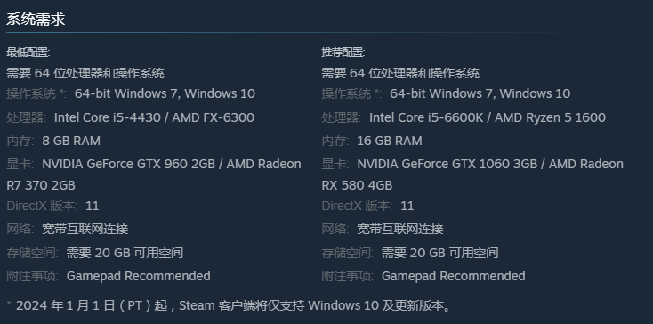 目前,该游戏已在Steam平台开放商店页面,玩家可前往查看详细信息。根据官方公布的系统需求,若以基础画质运行游戏,推荐使用i5-4430处理器、GTX960显卡,配备8GB内存和20GB可用存储空间即可流畅运行。若希望开启更高画质,建议升级至i5-6600K处理器、16GB运行内存以及GTX1060或更高级别的显卡,以获得更优质的视觉体验。对于追求极致性能的用户,配置越高,游戏表现越稳定。