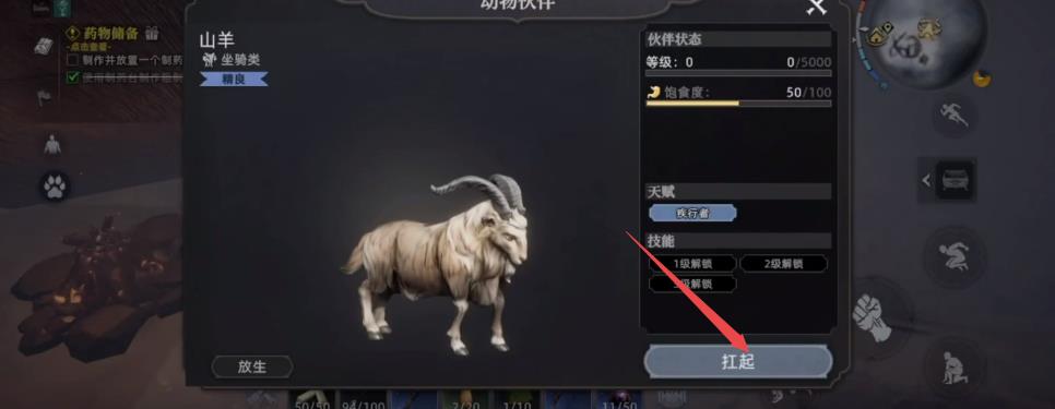 以山羊为例,这是一种非常适合前期驯养的实用型动物。玩家只需布置一个简易的捕兽陷阱,等待山羊进入触发区域即可完成抓捕。若在捕捉过程中造成较重损伤,建议先进行治疗再带回营地圈养。经过一段时间的喂养后,山羊便可成功驯服。它具备撞击树木的能力,能高效协助玩家获取木材资源,在游戏初期对物资积累有显著帮助。