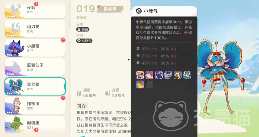 本期将为大家带来一位在崩坏因缘精灵中极具辨识度的角色——寐魔。这位精灵在外形设计上巧妙融合了蝴蝶与小兔子的特征,整体形象十分讨喜。其翅膀上点缀着爱心图案,尾部也呈现出明显的爱心形状,头顶则有类似兔耳的装饰,视觉上既梦幻又灵动。