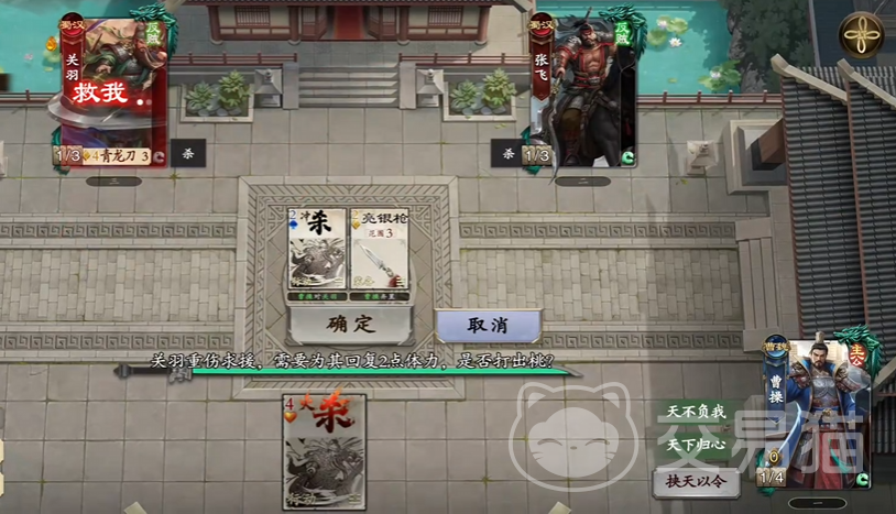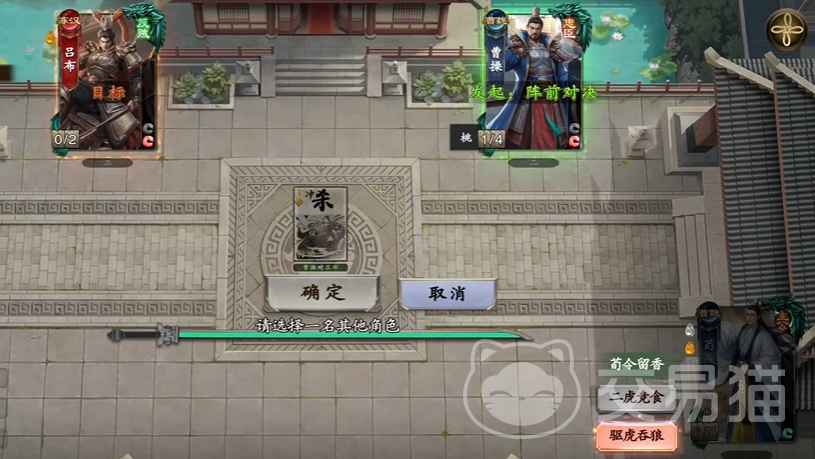 第50关:首先对曹操使用【杀】,曹操触发“乱世”技能反补一张【杀】。随后释放二技能,注意释放顺序必须优先选择曹操,再选定吕布为目标。最后使用三技能,同样先点击曹操、再点吕布,确保技能联动正确,即可成功通关。