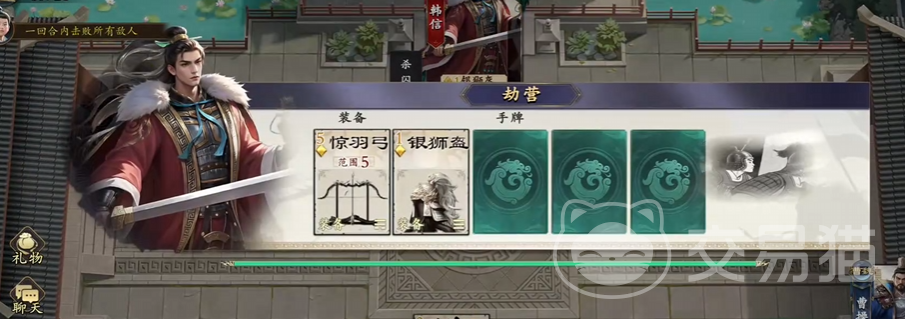 第35关:官方推荐方案为使用【夺粮结营】夺取敌方弓类装备,装备后本回合第一张杀具有强制命中效果,直接击杀目标即可过关。另一种可行方法为:曹操起手发动【挟天子以令诸侯】,从牌堆顶打出一张杀,再用【夺粮结营】获取闪牌,随后出杀完成通关。