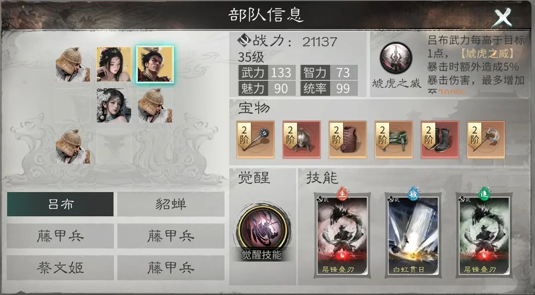觉醒技能的设计有效弥补了吕布单独作战时输出链条不足的问题。觉醒后,吕布能够精准锁定敌方兵力最低的目标,施加高额单体伤害,同时激活天赋中的斩杀与追击效果,增强连击频率。这一机制显著提升了他在战斗后期清理残局的能力,使其成为典型的收割型武将。鉴于其技能组整体输出强度极高,在资源有限的情况下,优先觉醒吕布是优于多数非三皇武将的选择,其成长潜力和上限表现均属顶尖水平。