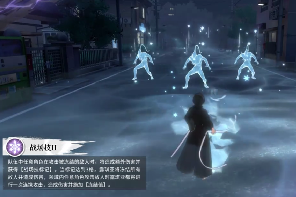 第二个战场技能则强化了对被冻结目标的打击效率。每当队友攻击处于冻结状态的敌人时,不仅能造成额外伤害,还能获得战场技标记。当标记累计至3层时,露琪亚将发动群体冻结,将所有敌人定身并施加伤害。此外,在此领域内,任何角色发起攻击都会引发露琪亚的连携技,追加一次附带冻结值的打击。