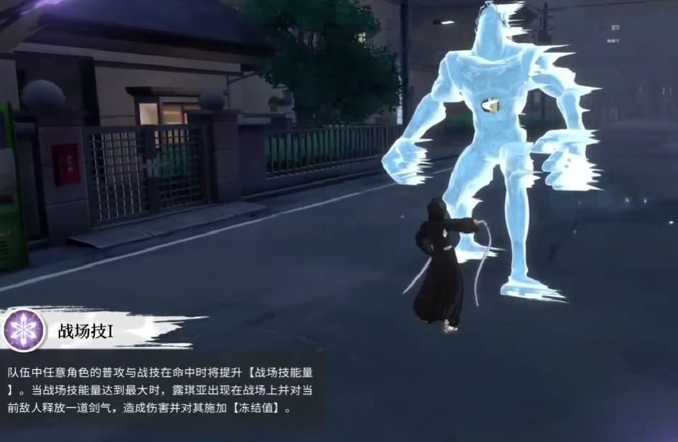 第一个战场技能允许队伍中任意角色在使用普攻或战技命中敌人后,为全队积攒战场技能量。当能量条充满时,露琪亚将向前方释放一道强力剑气,不仅造成范围伤害,还会额外附加冻结值,进一步推进控制节奏。
