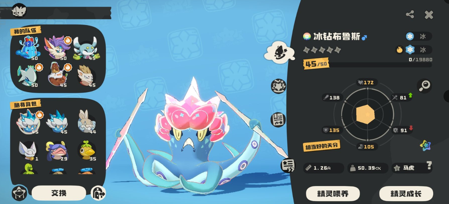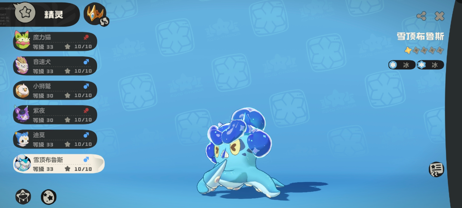 最终形态名为冰钻布鲁斯,外形发生显著变化,整体体型更加庞大,通体呈现剔透的冰蓝色调,头部生长出闪耀寒光的钻石状结晶。作为海滩区域的顶级精灵之一,不仅战斗力强劲,还能辅助玩家提升水上移动效率,甚至可牵引角色渡河。建议战斗时先用星星魔法使其陷入眩晕状态,再搭配火神音速犬等高输出精灵进行快速压制,以提高捕获成功率。