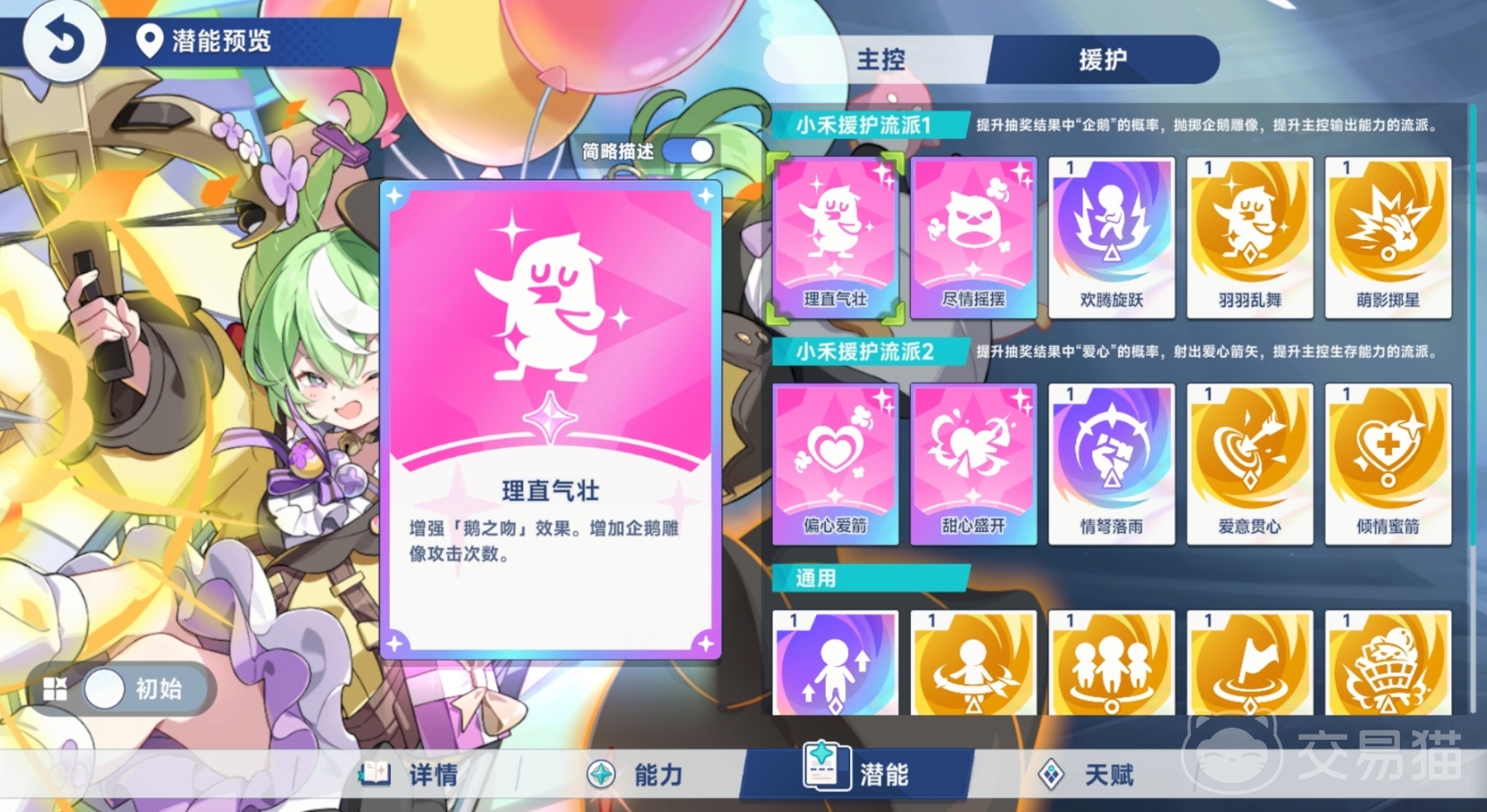 在潜能搭配方面,小禾主要分为“鹅之吻”与“爱之吻”两种流派路线。“鹅之吻”适用于援助技能中企鹅图标多于爱心的情况,推荐配置理直气壮、尽情摇摆与欢腾旋跃等潜能,以强化攻击类增益效果,进一步放大主控的输出潜力。“爱之吻”则在爱心数量占优时激活,侧重于提升队伍生存能力,在面对高爆发BOSS战时尤为实用,能有效维持主控血量安全,避免战斗意外中断,核心潜能包括偏心爱箭、甜心盛开和情弩落雨。