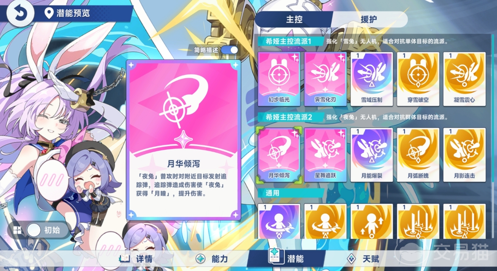 在实际配队中,若以希娅为核心构建光系队伍,玩家可根据战斗需求选择雪兔流或夜兔流两种不同发展方向。雪兔流侧重于强化单体穿透伤害,适用于应对精英或BOSS战,关键潜能包括霁雪化刃、幻步临光与雪域压制;夜兔流则偏向群体压制,在面对复数敌人时优势明显,核心潜能为月华倾泄、星舞追跃与月能爆裂。资源充足的玩家建议分别配置两套方案,以便灵活应对不同关卡环境。