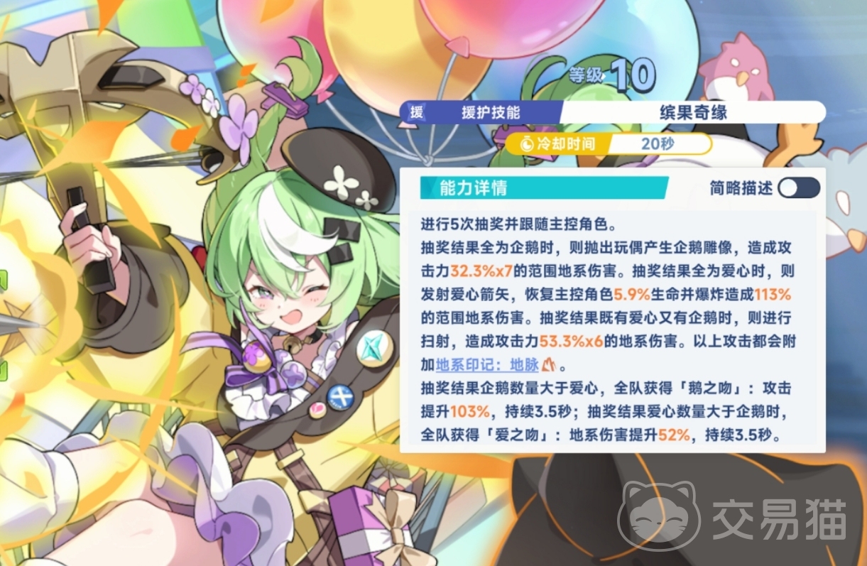 作为援助角色时,小禾的辅助价值更为突出。其援助技“缤果奇缘”会随机投掷出企鹅或爱心道具,不同组合带来不同的战场效果。若仅出现企鹅,则触发七次地属性范围伤害;若全为爱心,则为主控角色恢复生命值并附加一次范围爆炸伤害;若两者混合,则对敌方单位进行扫射攻击。此外,当企鹅数量多于爱心时,全队获得攻击力增益;反之则提升全体地系伤害。无论结果如何,“缤果奇缘”都会为敌人附着地系印记,便于主控角色后续引爆,极大增强队伍连携输出效率,这也印证了援助位是小禾的最佳定位。