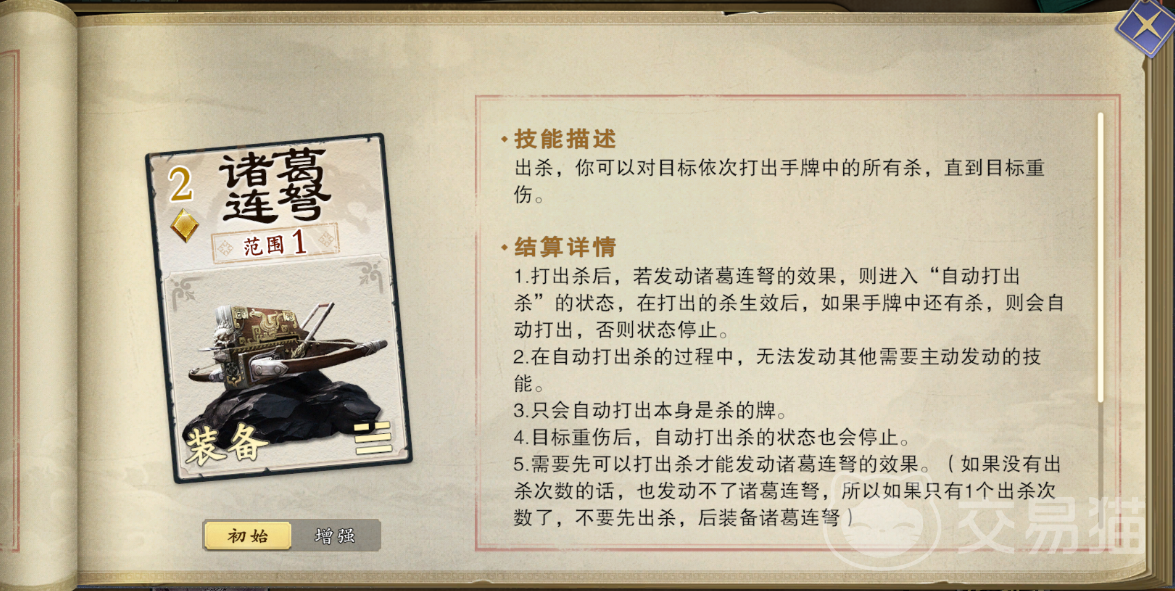 武器类装备直接影响角色的攻击能力与范围。诸葛连弩具备连续使用【杀】的效果,能够在短时间内发动多次攻击,适用于快速压制血量较低的目标,但其缺乏防御手段,面对具有反制能力的角色时容易被针对。鸣鸿刀则要求目标需打出两张【闪】方可抵消一次【杀】,极大消耗对方闪牌资源,适合用于突破高闪备战组合,但若未能命中,使用者需弃置一张装备,风险较高,需谨慎使用。轩辕剑拥有特殊效果,可使目标的防具和武将技能失效,是对抗依赖装备或强力技能敌人的理想选择。方天画戟允许玩家弃置手牌或装备以增加攻击目标数量,尤其适合在多敌围攻时实现群体打击,有效改变战场兵力分布。