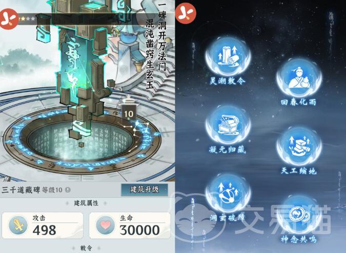 作为宗门的核心建筑,三千道藏碑直接影响其他所有建筑的最高等级上限,所有建筑等级均不可超越其当前等级。因此,优先提升该建筑成为玩家发展的首要任务。此建筑具备六项独特技能效果:其一为灵潮敕令,激活后可使弟子工作效率翻倍,宗门资源产出提升100%,持续时间为12分钟。