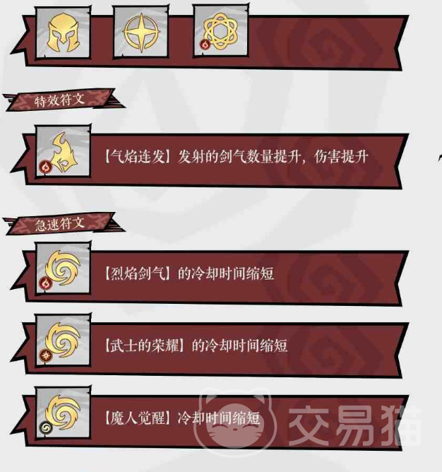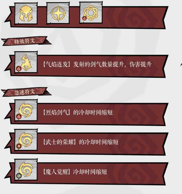 该流派只需两件套即可使“巨型气焰”的基础伤害提升32000%,无需强求四件套带来的减CD收益。符文选择遵循相同逻辑。初始阶段可点出“火系亏”,前期使用“居合”,后期替换为“血怒”;威能技推荐“气焰连发”;主宰技前期带“烈焰残响”,后期若穿戴四件套则伤害反而受限,建议更换为“风行者”;守护技能选择“光辉”,因火系太刀需贴近敌人输出,近战适配性更强。