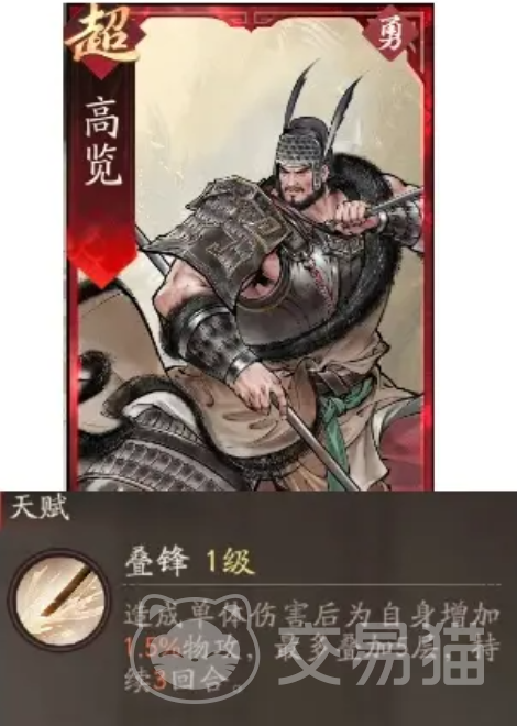 高览:通过签到即可获取的强力前期副将,拥有顶级基础强度。其天赋可提供单体伤害增益,并每次提升1.5%自身物理攻击力,最多叠加五层。叠满后在三回合内爆发显著输出增幅,非常适合需要快速清场的推进阵容。作为早期易得武将,高览的成长潜力和实战表现均属上乘。