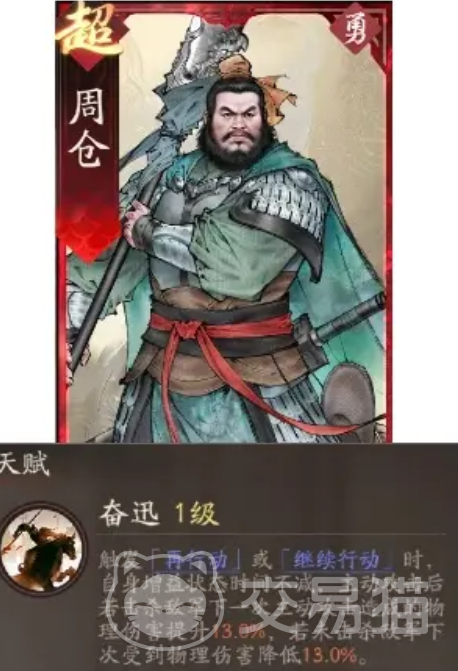 周仓:专精于再行动机制的强力辅助型副将,尤其适配关羽等依赖连续出手的核心输出。其技能可在满足条件时赋予主将额外行动机会,极大增强连击节奏。若周仓的攻击成功击杀目标,则下一次行动伤害提升13%;即便未击杀,也可获得13%的物理减伤效果,攻守兼备。该被动无持续时间限制,稳定性极强。