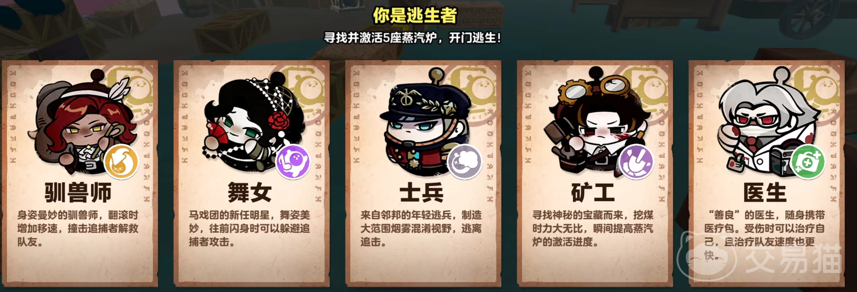 每局游戏由五名玩家组成,系统会随机分配角色,形成两个对立阵营:一名追捕者和四名逃生者。逃生方的目标是启动地图上的七座蒸汽炉中的任意五座,从而激活逃生门。当逃生门开启后,至少需要有三名逃生者成功撤离才能赢得胜利。若场上仅剩一名逃生者未被淘汰,地窖将会打开,该玩家可独自逃生并获得个人胜利,但整体阵营视为失败。