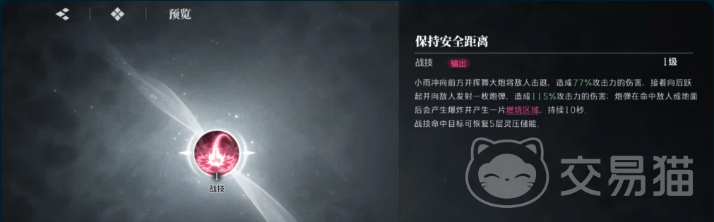 战技“保持安全距离”是一项兼具位移与输出功能的技能。施放时,䌷屋雨会扛起炮筒向前突进并对目标造成77%的伤害,随后跃起并向指定方向发射一枚强力炮弹,造成115%的伤害。炮弹命中或落地后会发生爆炸,生成一片持续存在的燃烧区域,进一步扩大控制范围并附加环境伤害。