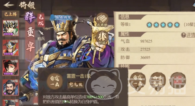 前排承伤角色推荐使用董卓,他不仅拥有出色的生存能力,还能完美契合麻痹流节奏。其一技能可在攻击敌方最高战力单位时,将所受50%的伤害转化为护盾。达到11星后,只要场上存在被麻痹的敌人,董卓即可获得相当于自身11%最大生命值的血量加成,并额外生成1500点护盾,持续8秒。配合曹操提供的群体麻痹概率,几乎可确保护盾不断刷新,稳固前排防线。