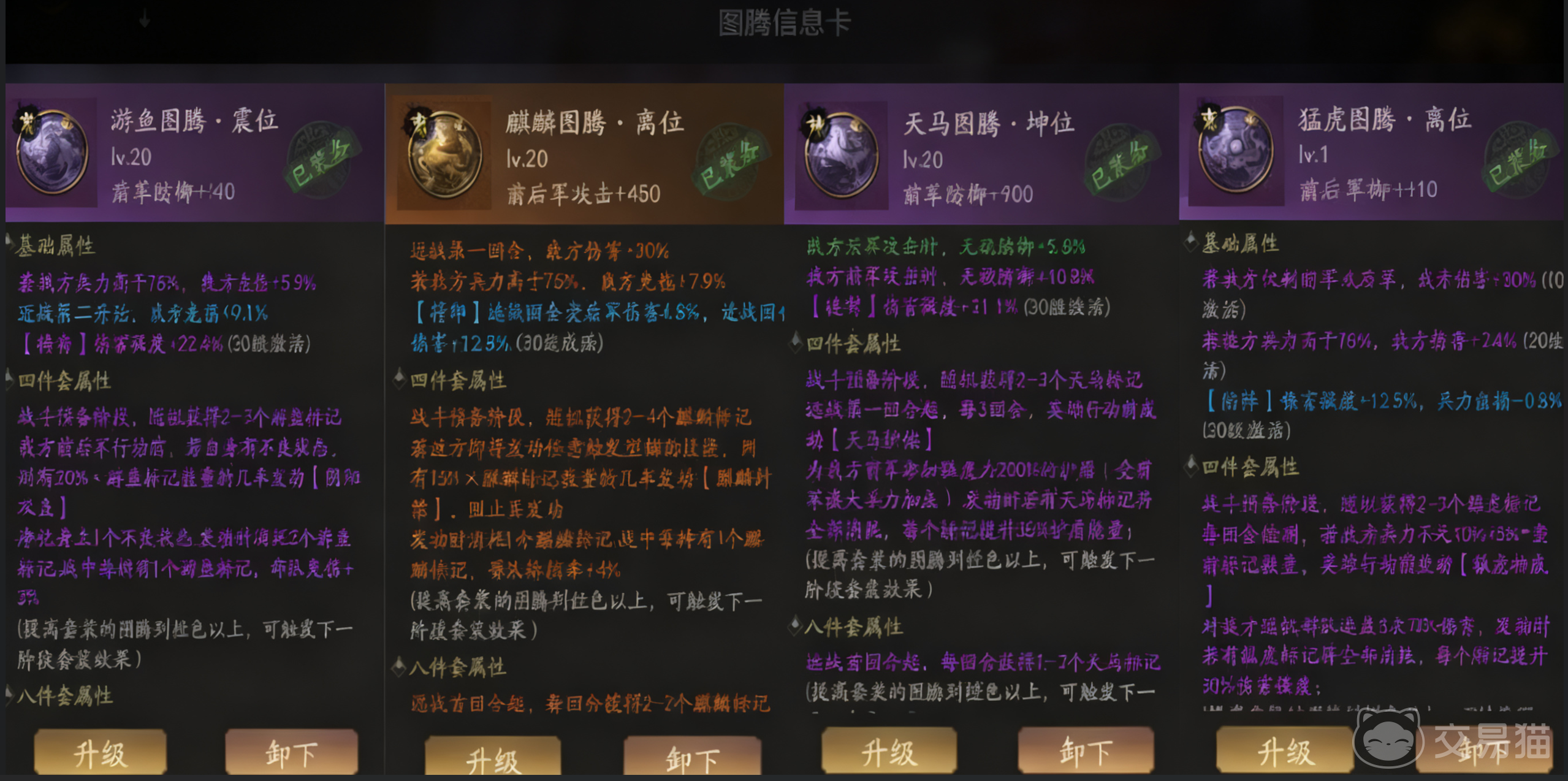 图腾系统的玩法围绕八卦布局与组合搭配展开。每位武将拥有八个可激活的图腾槽位,对应八卦方位及其专属加成效果:乾位增强前军攻击,坎位提升后军兵力,艮位增加后军攻击力,震位强化后军防御,巽位提高前军兵力,离位同时加强前后军攻击,坤位加成前军防御,兑位则提升前后军兵力。玩家可根据战术需求自由装配图腾,当任意四个相同类型的图腾组成一套时,即可激活“四件套属性”;若八格均装备同类型图腾,则可解锁更强力的“八件套属性”,获得额外战斗优势。