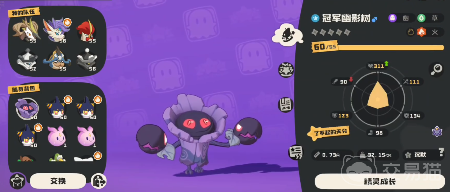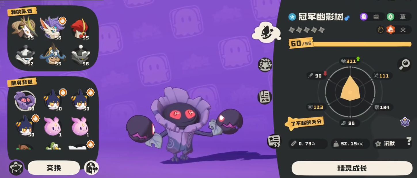虽然外形上与常规幽影树没有明显差异,但本次赠送的版本拥有顶级个体值和卓越天赋,整体数值达到最优标准。作为赛事冠军同款精灵,其战斗特性高度还原实战配置,具备更强的竞技潜力,适合用于PVP对战培养。
