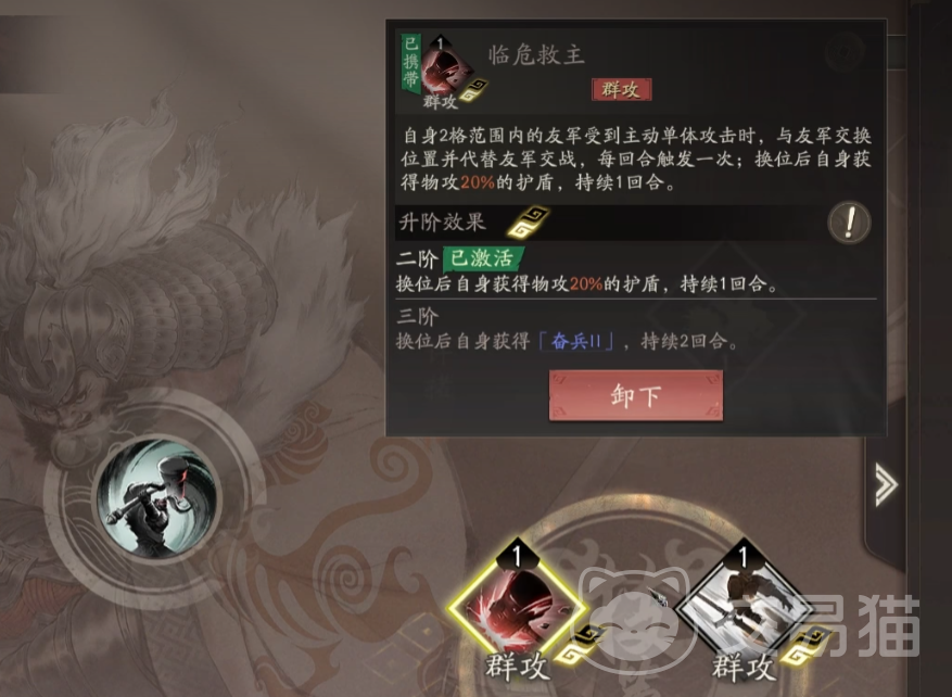 另一个关键技能“裸衣鏖战”可使目标物理防御降低50%,该减防效果无法被抵抗或清除,尤其适用于对抗BOSS类高防单位。配合后排输出角色使用,能够显著提升整体爆发速度。此外,“临危救主”赋予他支援能力,可与队友交换位置并替其承受伤害,进阶至二阶后还能获得护盾,有效保障主力输出的安全。