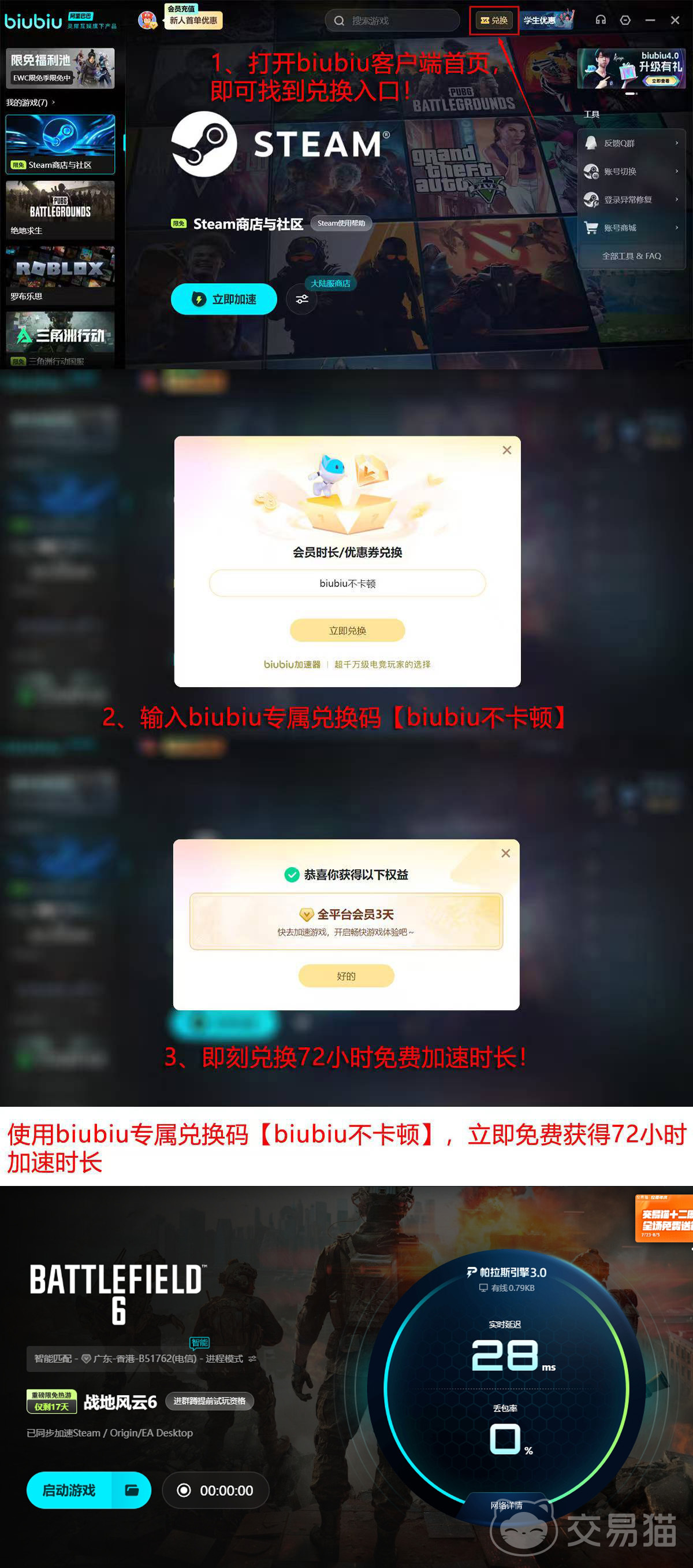 为进一步打磨产品体验,项目团队特别邀请职业电竞选手左梓轩担任程序体验检测官,参与功能测试与优化建议反馈,持续提升服务品质。新用户注册即可获得24小时免费试用时长,同时可通过输入活动口令【biubiu不卡顿】在首页额外领取72小时体验权限,累计可达96小时无忧畅玩。