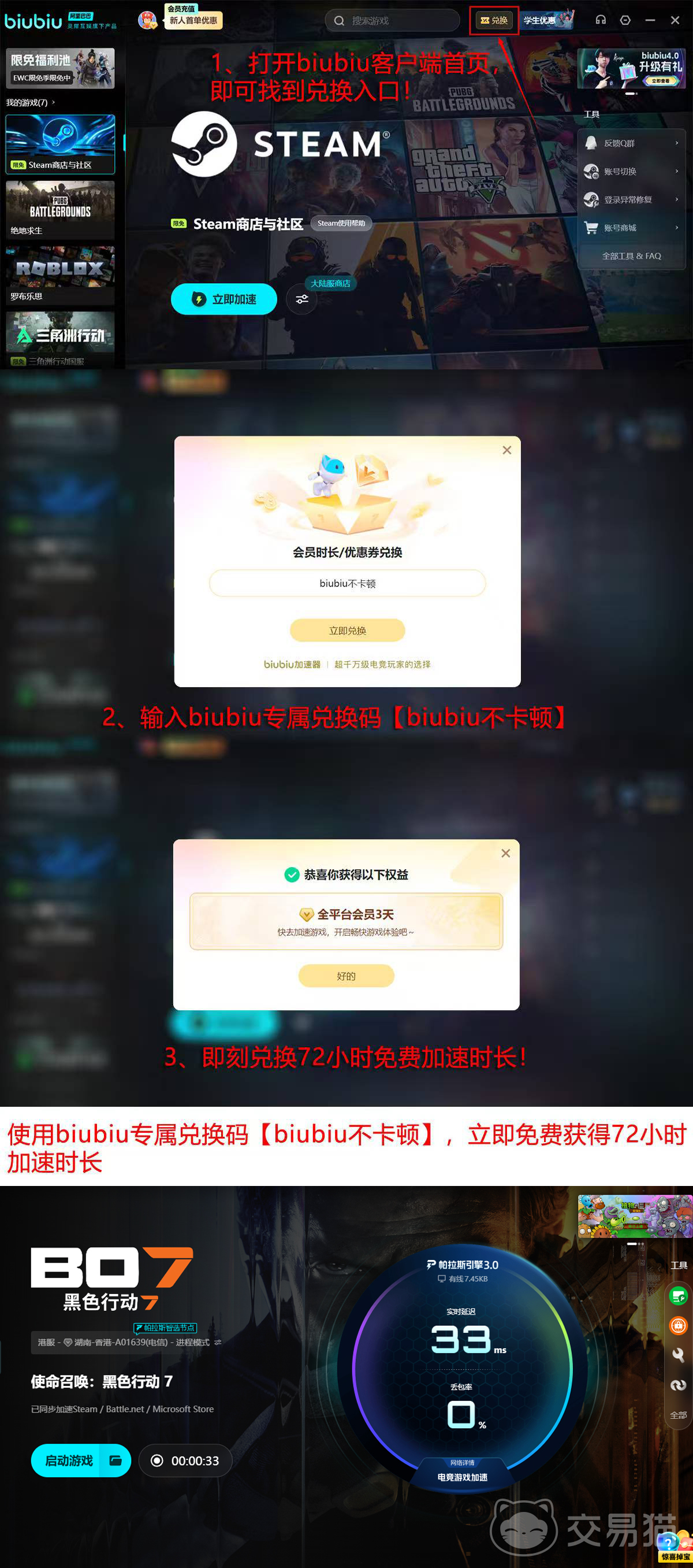目前,新用户注册后可直接获得24小时免费使用权益。同时,输入特定口令【biubiu不卡顿】还可额外兑换72小时体验时长,总计可达96小时,便于玩家全面评估服务效果。