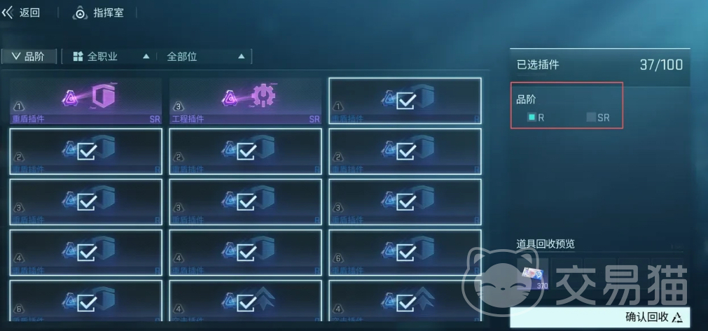 关于获取途径,通用插件可通过黑盾征募和限时征募活动获得。需要注意的是,专属插件的获取需先拥有对应角色本体,而通用插件则无此限制。对于多余的插件资源,系统支持回收处理。回收功能位于角色插件装备界面,点击右侧品阶可进行批量操作。R级插件回收后可获得信赖之证,SR级则返还信赖之光与信赖之证,有助于资源再利用。