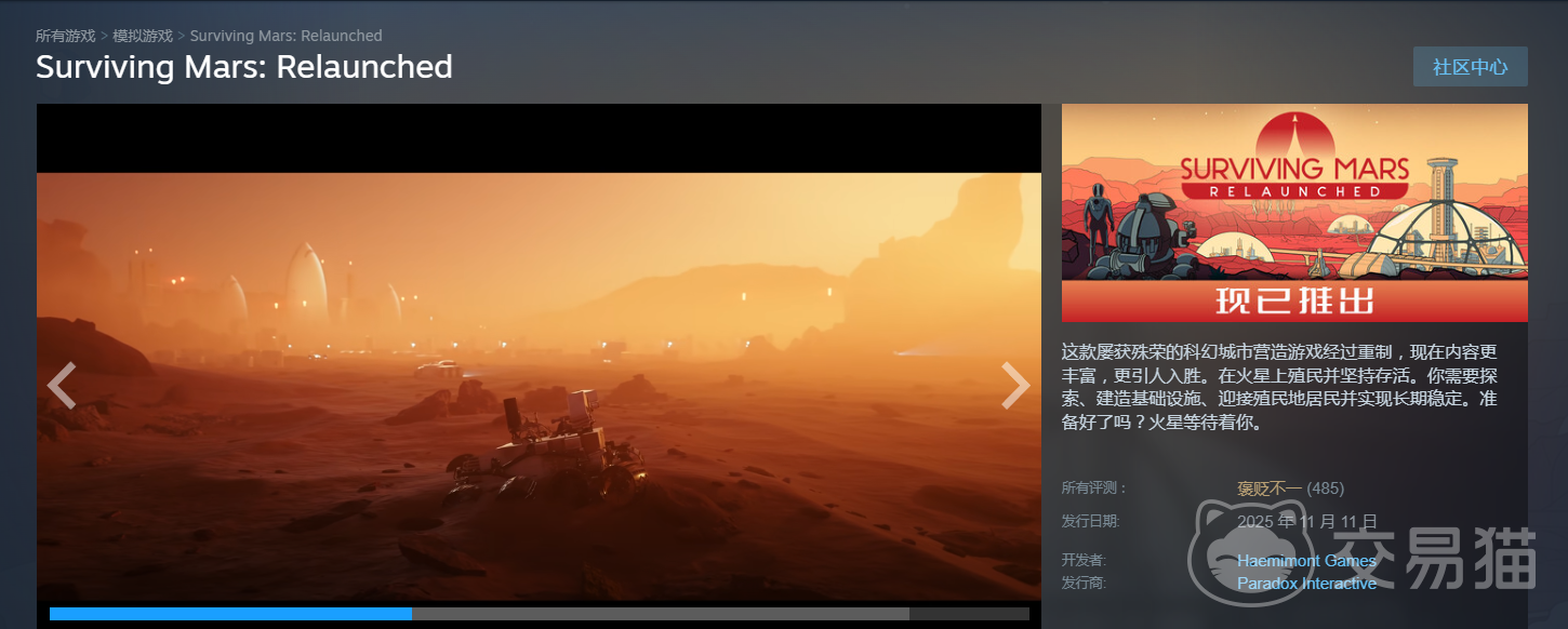 由于该游戏在Steam商店中未使用中文命名,直接搜索“火星求生”无法找到对应页面,必须输入英文全称《Surviving Mars: Relaunched》才能定位到商品详情页。不过值得庆幸的是,游戏本身支持简体中文界面,语言选项可在设置中开启,大大降低了国内玩家的理解门槛,便于更顺畅地管理殖民地和应对极端环境。