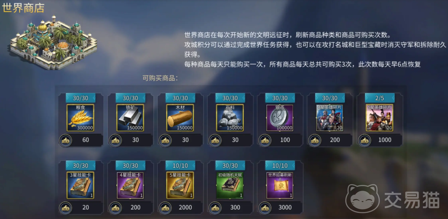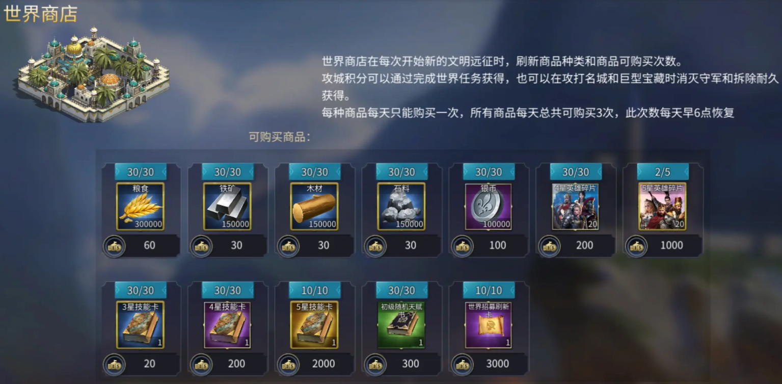 以上就是《英雄之城3》世界商店的积分使用指南。需要注意的是,所有商品均有每日限购次数且随远征更新而轮换,因此建议玩家密切关注商店刷新动态,及时兑换所需资源,最大化攻城积分的使用效率。