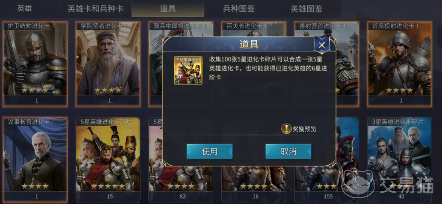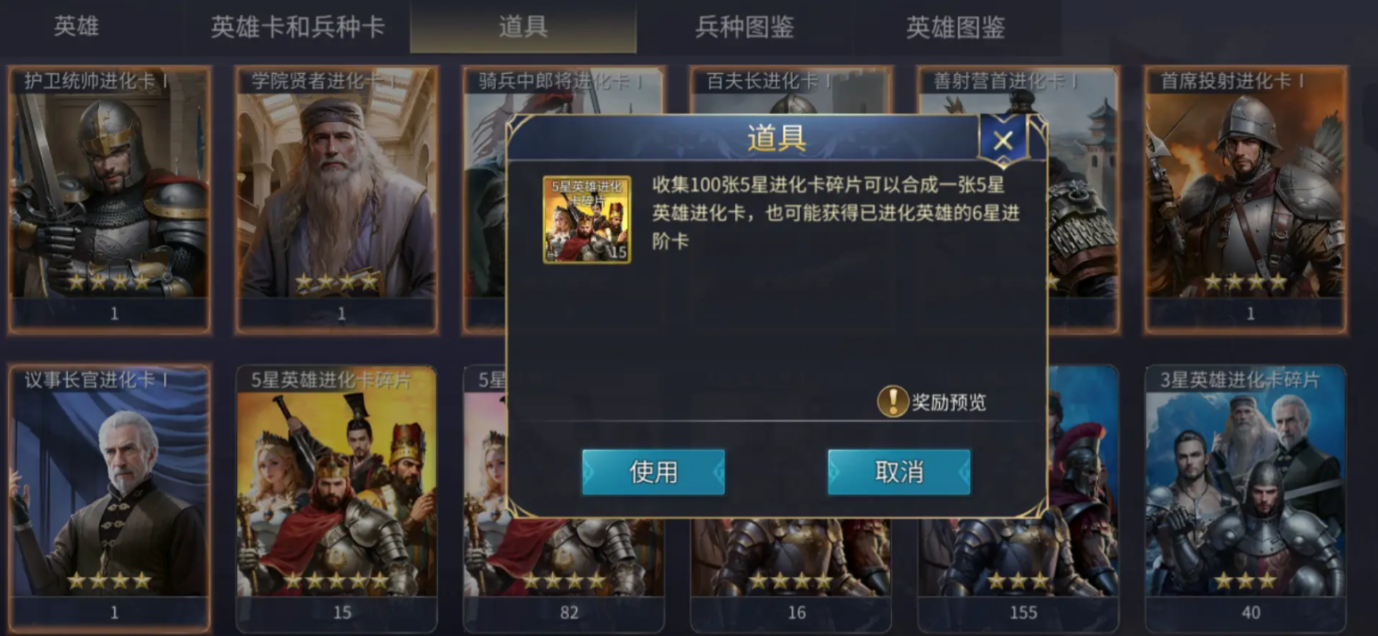 首先来解析几类关键道具的功能。4星英雄进化卡碎片是用于英雄升星的重要材料,当英雄等级达到上限后,需通过进化卡实现星级提升,例如从3星进阶为4星,或由4星晋升至5星。集齐100个该碎片后,可随机合成一张4星英雄的进化卡,从而推动特定英雄完成进阶。