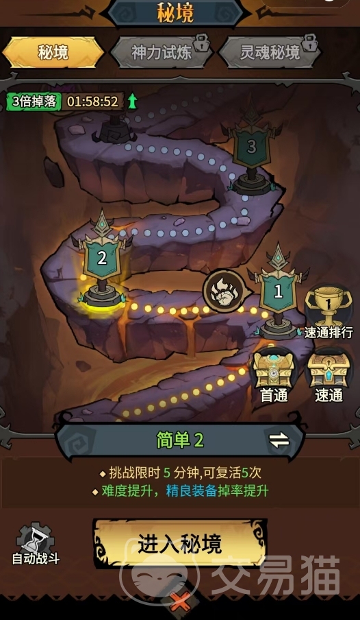 本作的核心机制围绕“割草+刷装”展开,包含多个层级的副本挑战。每个副本需依次通关前序难度方可解锁下一阶段。随着难度递增,允许使用的复活次数减少,挑战时限也更为紧张。但相应的,高等级关卡提供的经验奖励更加丰厚,怪物掉落的装备品质也更高。此外,每关设有首通奖励与速刷奖励两种额外收益——前者只需完成挑战即可领取,后者则要求在规定时间内快速通关才能获得。