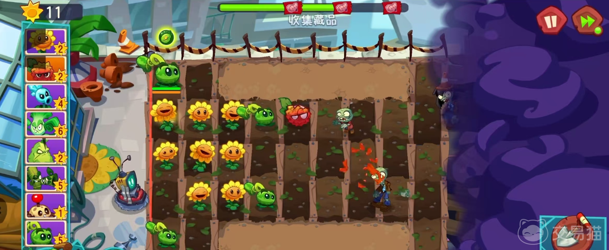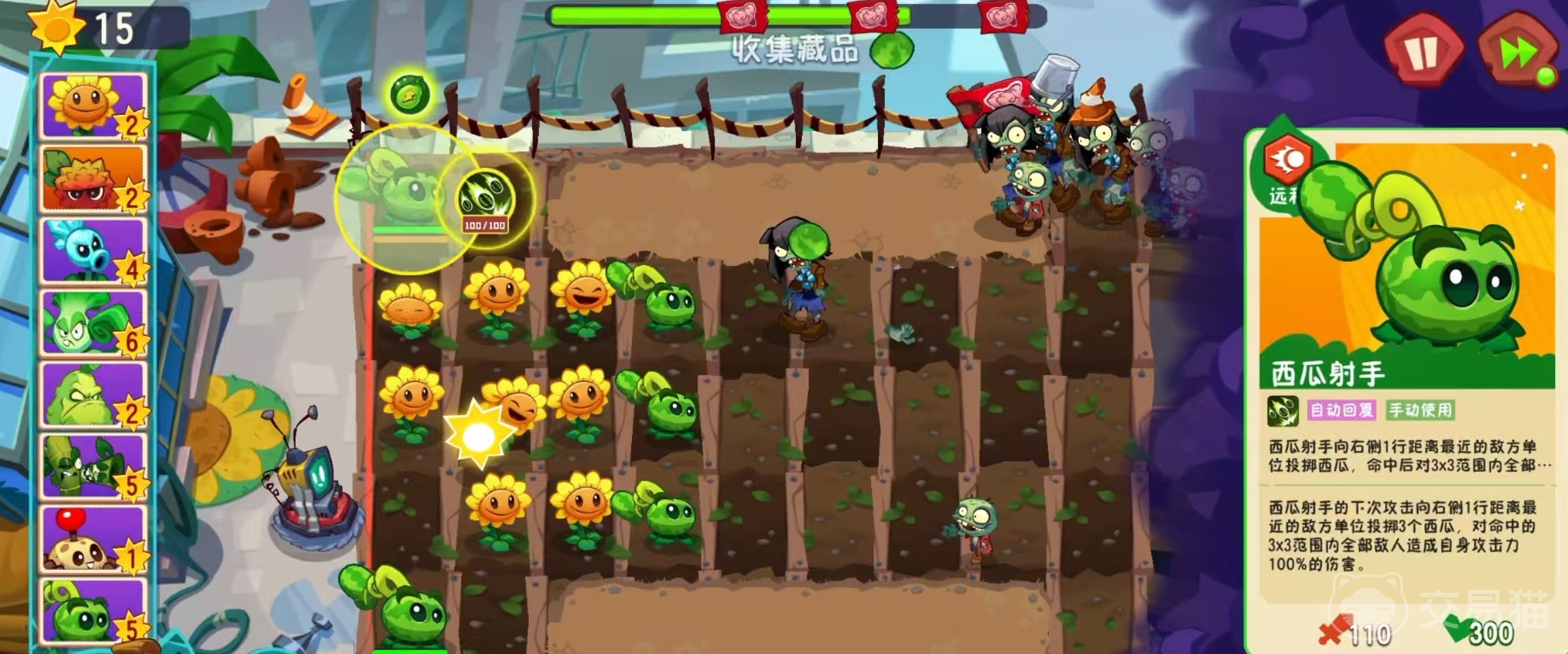 除了常规攻击外,西瓜射手还拥有一项强力技能“三连击”:下一次攻击将同时投掷三个西瓜,命中后对3×3区域内的所有敌人造成等同于其100%攻击力的范围伤害,大幅提升瞬间爆发力。当使用叶绿素激活后,西瓜射手可在全地图随机位置发动高伤害打击;若搭配玉米卷使用,其普通攻击还能附加减速效果,进一步增强控场能力。正因如此,它在应对密集僵尸群时表现出色,是清理成群敌人的理想选择。不过需要注意的是,该植物攻击节奏较慢,两次投掷之间存在较长间隔,容易在面对高速或大量涌来的僵尸时出现输出空档。