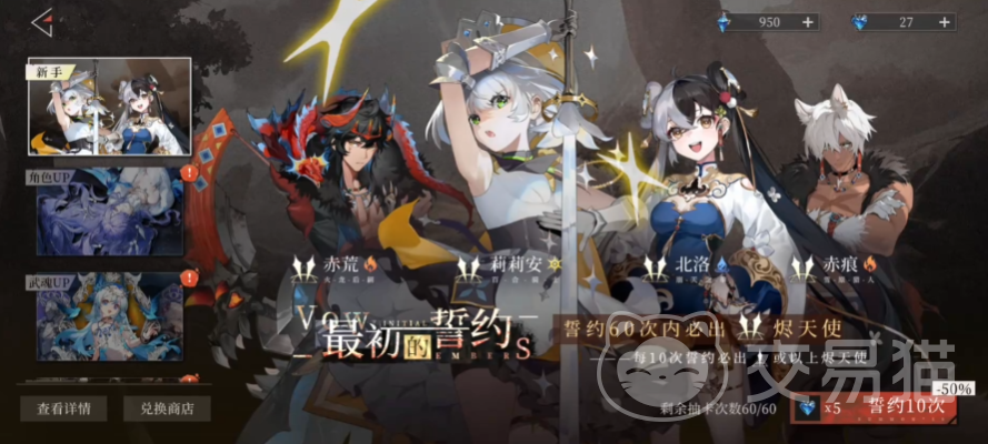 游戏中的可抽取角色统称为“烬天使”。单次抽取获取烬天使的基础概率为0.7%,而综合包含保底机制后的实际出率则为2.2%。这一数值与市面上多数同类作品持平,属于较为标准的设计范围。每进行60次“誓约”抽卡,必定能通过保底机制获得一名高稀有度角色。若此次抽到的是非UP的高星角色,则有50%的概率使下一次抽取UP角色的权重提升,从而增加后续获取主推角色的机会。