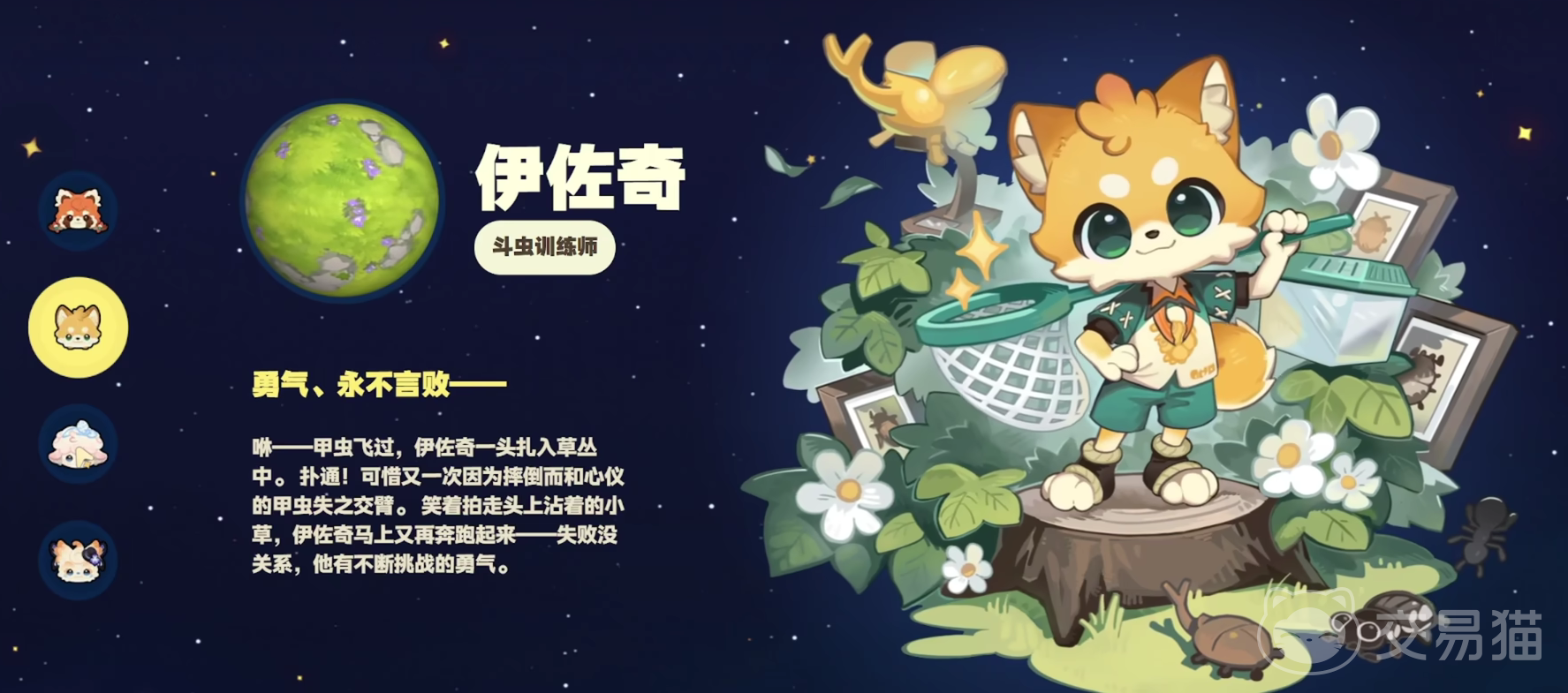 第二位角色伊佐奇同样以狐狸为设计蓝本,但其外观为浅黄色毛发,性格开朗积极,职业设定为斗虫训练师。他擅长使用捕虫网捕捉稀有昆虫,同时能在探险途中帮助清除有害虫类,保障玩家的探索安全。伊佐奇不仅充满勇气,还能在野外行动中提供鼓舞,是冒险旅程中值得信赖的伙伴。