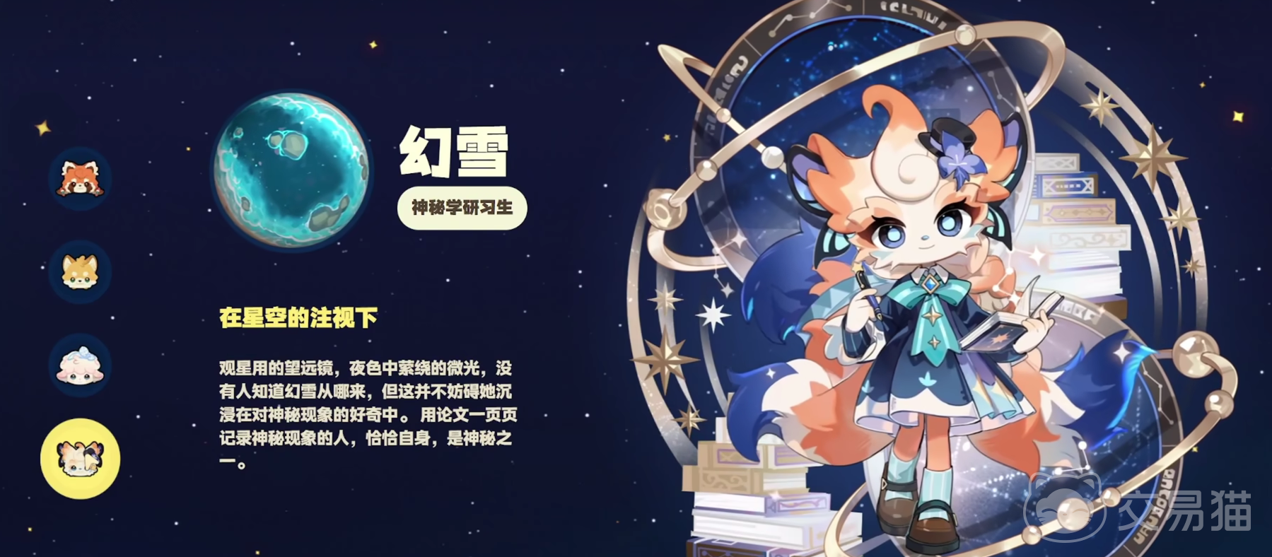 最后一位角色幻雪,原型为传说中的九尾狐,职业为神秘学研习生。她常在夜晚观测星空,研究宇宙奥秘,与游戏中星际探索的主题紧密相连。作为解答未知现象的关键人物,幻雪将在玩家遇到谜题或疑问时提供指引,扮演类似导师的角色,帮助玩家深入理解游戏世界的深层设定。