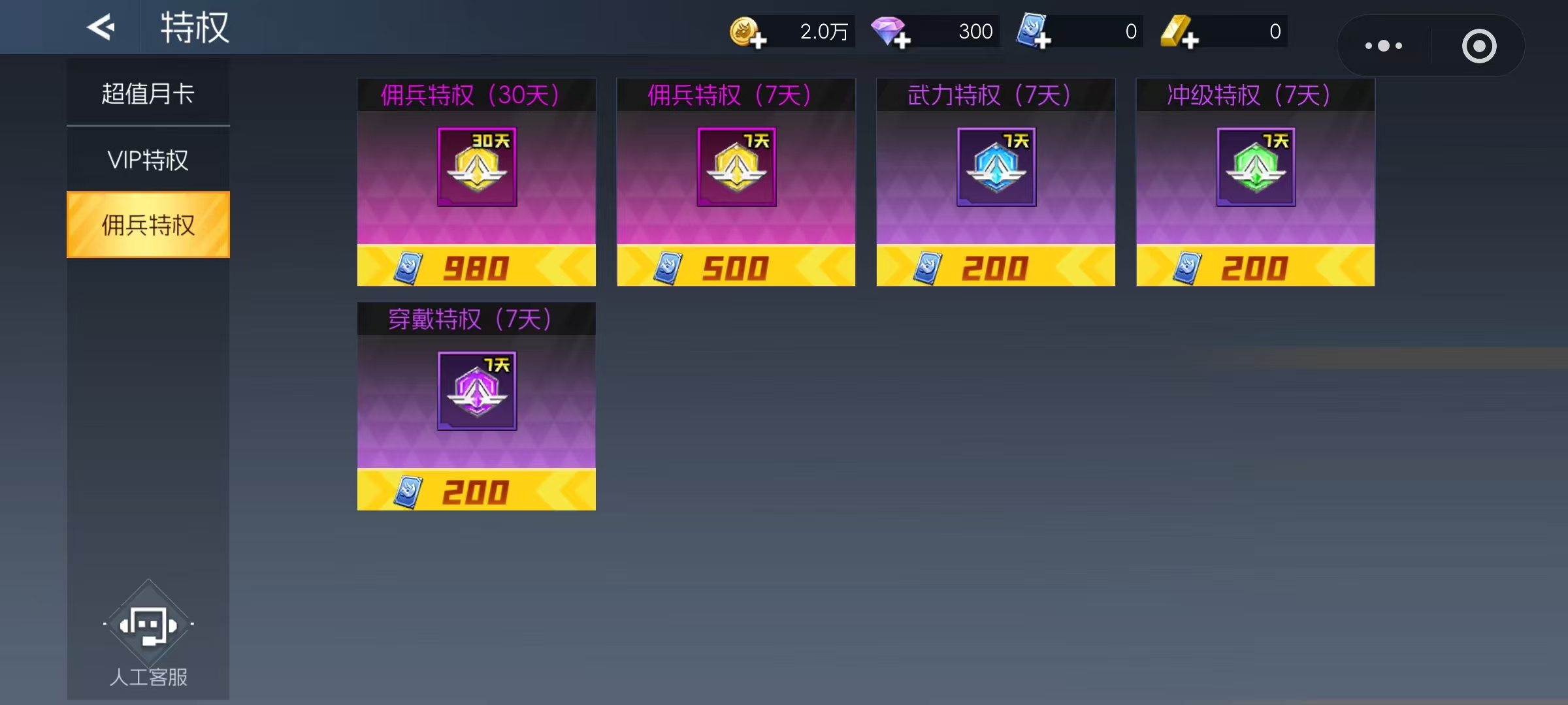 佣兵特权模块包含佣兵特权、武力特权、冲级特权和穿戴特权四项内容。此类权限可通过点券直接激活,而点券可通过购买月卡等活动逐步累积。其中,佣兵特权最为实用,一经激活即可连带解锁其余三项特权,属于最优投资选项。武力特权允许技能等级上限提升,增强角色输出能力;冲级特权提高主线关卡所获经验,加快升级节奏;穿戴特权则可让角色提前5级穿戴高阶装备,打破等级限制瓶颈。