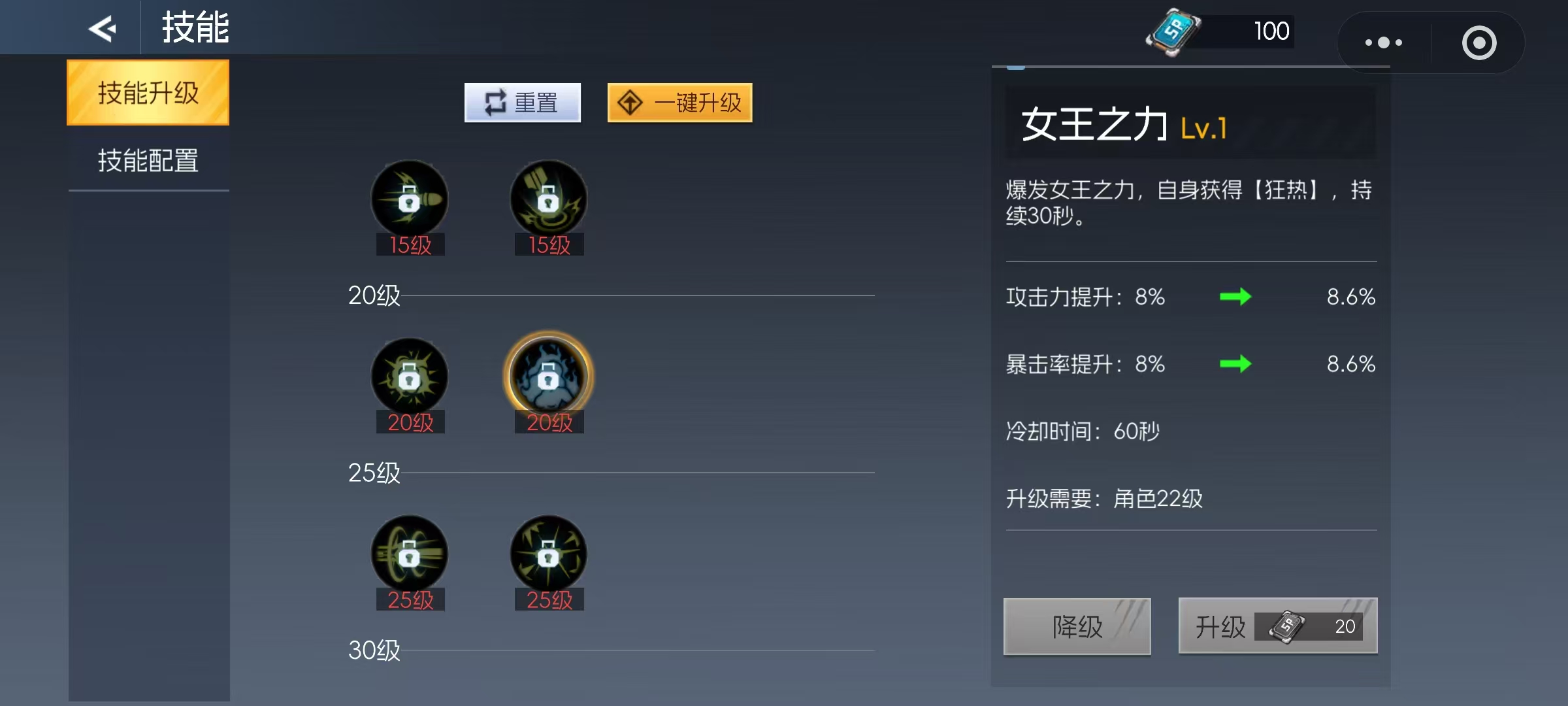当角色成长至20到40级阶段,20级解锁的女王之力成为必点技能,开启后可进入持续30秒的狂热状态,全面强化攻防属性,为打出高额爆发创造条件。而到了35级开放的激光爆轰,则是一项无需引导、自动锁定全场目标的脱手技,极大提升了输出安全性。这两个技能与前期已成型的引力弹形成良好联动,既保证了范围压制力,又增强了持续作战能力。