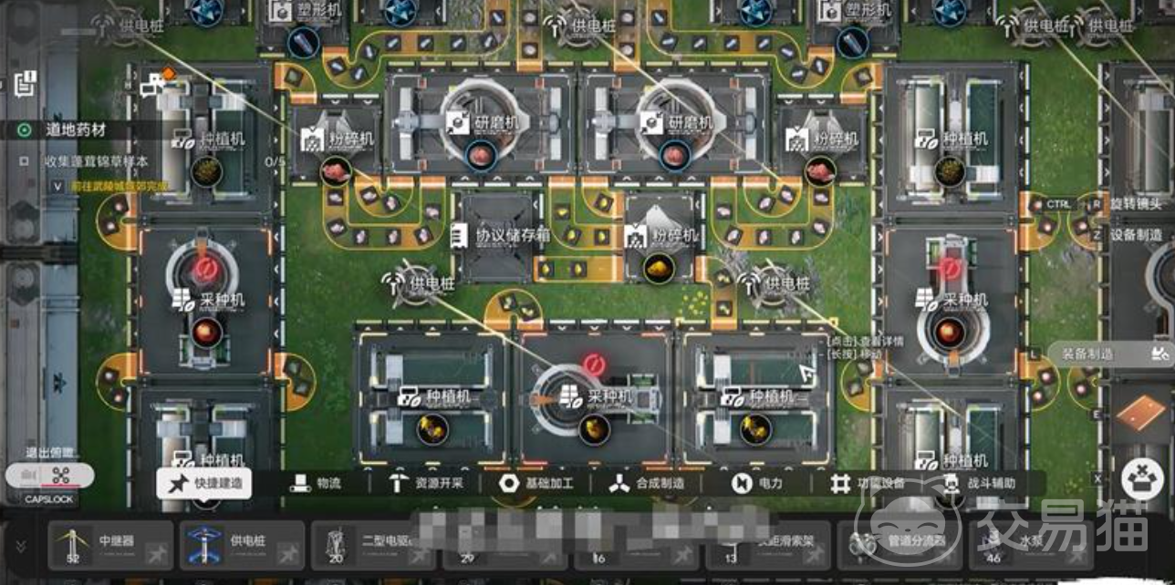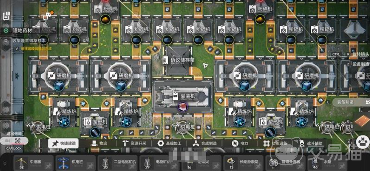 要成功搭建一个功能完整的工厂体系,玩家需重点关注三大核心模块:协议核心的部署、产线结构的设计以及电力网络的覆盖。协议核心作为整个设施的中枢,其周围黄色区域即为有效供电范围。在此区域内,可布置精炼炉、粉碎机、塑形机等关键加工设备。在正式投产前,必须先解锁对应蓝图。建议初期优先建设两条基础产线:第一条为紫金矿→精炼炉→塑形机→灌装机,主要用于零件制造;第二条则由种植机→粉碎机→灌装机构成,专注于药品生产,满足前期消耗性资源的需求,为中后期扩张打下坚实基础。