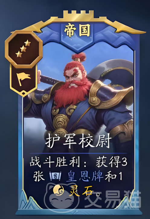 此外,三星卡牌护军校尉也是前期不可或缺的辅助单位。其技能为每场胜利后提供3张皇恩牌及1枚灵石,在过渡阶段具备极强的续航能力,堪称性价比极高的功能性单位。合理利用其战斗收益,能有效加快中期节奏。