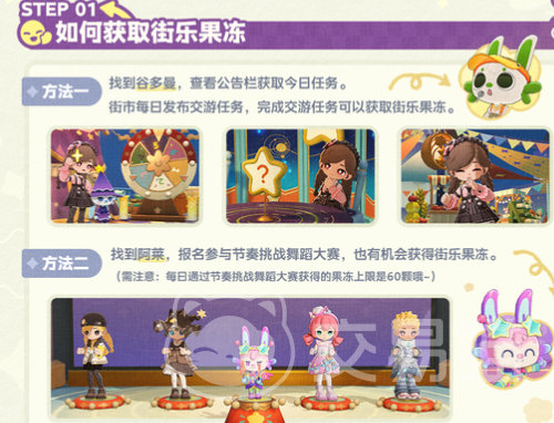 想要深入体验星空街市的内容,首先需要获取通行证——街乐果冻。这种广受喜爱的零食不仅是通行的关键,更贯穿于各种活动之中。每日前往公告栏寻找古多曼,即可接取独特的社交任务。此外,也可与其他玩家组队同行,共同完成小目标,收集晶莹剔透的果冻。若你热爱节奏与律动,不妨前往寻找阿菜报名参与舞蹈挑战赛。成功通关后不仅能感受满满的成就感,还能赢得60个果冻奖励。