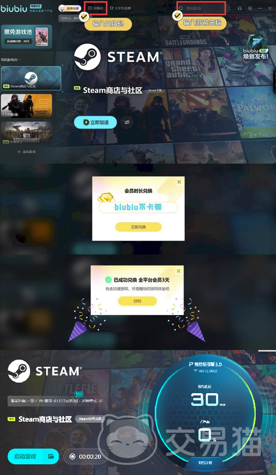 首次注册用户点击相应按钮完成安装后即可自动获得24小时免费加速时长,若在客户端内输入兑换码“biubiu不卡顿”,还可额外领取3天免费使用权限,总计长达96小时的完整体验周期极具诚意。此外,平台还会不定期推出针对特定热门游戏的限时免费加速活动,覆盖范围涵盖多款高人气作品,助力玩家摆脱延迟困扰,畅享稳定流畅的在线体验。