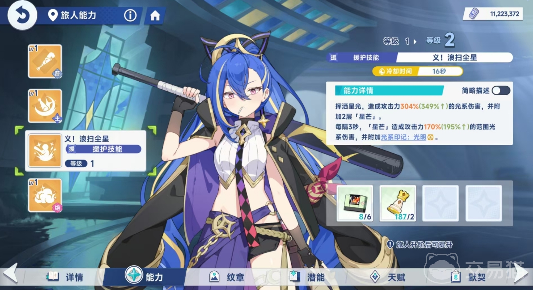 密涅瓦的核心机制围绕“援助技”展开。该技能不仅能对敌人造成直接光系伤害,还会附加“星芒”状态。每三秒,一层星芒会自动引爆,再次造成范围伤害,并在目标身上叠加光系印记。这一机制极大提升了主控角色触发印记爆炸的频率,从而显著增强整体输出效率。此外,她的绝招拥有极高的覆盖率和持续性,每0.3秒发动一次范围攻击,总共持续5秒,在面对群体敌人时清场能力尤为突出;即便在单体战斗场景下,也能有效补充队伍的输出缺口。