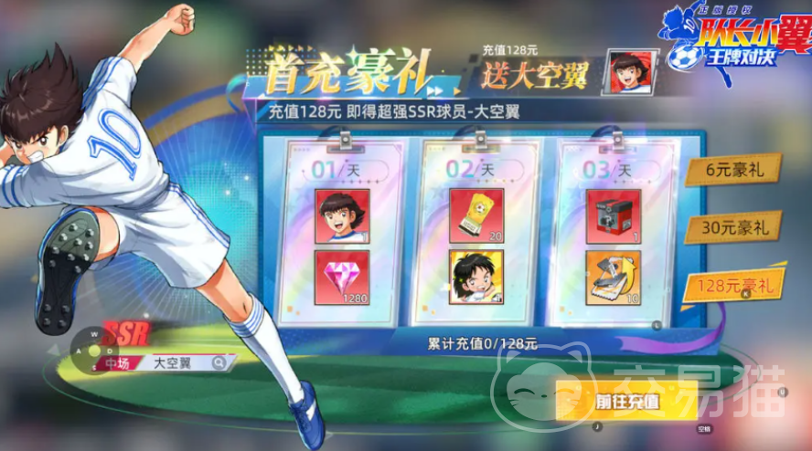 其次,充值回馈活动分为三个档位,其中128元档最具吸引力,可直接获得顶级前腰球员SSR大空翼。这位主角级角色不仅拥有强大的技能机制,还能显著提升整体队伍输出能力。其他两档也有相应回报:6元档提供彩钻、新秀召集券及基础资源礼包;30元档则额外附赠专属头像框和超凡护具,增强角色属性表现。而选择128元档还将解锁“空域小将”主题外观以及超凡护踝手套等稀有道具,全面提升视觉体验与实战优势。