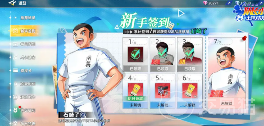 首先值得关注的是新手登录签到活动。只要在游戏内连续登录7天,即可免费获得三名实用球员,为初期阵容打下坚实基础。第7天将送出两名SSR级别的核心球员——防守稳健的石崎了与进攻犀利的新田瞬,同时还包括SR门将森崎有三。这三位球员分别胜任不同位置,能够有效支撑起前中后三条线的基本配置。此外,每日签到还会赠送新秀召集券和培养材料,助力玩家持续提升战力,建议每天按时登录领取奖励,该活动剩余时间不足12天。