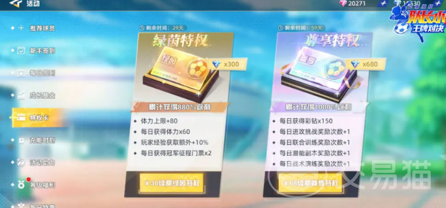 最后,特权卡系统为活跃玩家提供了额外增益。“绿茵特权”和“尊享特权”激活后,均可享受体力上限提升和每日额外体力补给。其中,“尊享特权”更为全面,每日可领取150彩钻,并增加副本挑战次数,有助于加快资源积累速度,提升整体游戏体验。