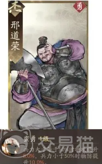 最后推荐一位前期易得且性价比高的副将——邢道荣。虽然其品质不及前三者,但凭借“蛮勇”天赋,在兵力比例≥50%时可提升8%物攻,而当兵力低于50%时则额外获得最高10%的物防加成。这种攻防兼备的特性使其成为吕玲绮在开荒时期的理想搭档,既能保证输出又能提高存活率,非常适合新手阶段过渡使用。