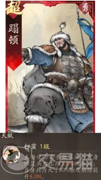 第二位值得推荐的是通用型强力副将蹋顿。他的核心天赋“扫蛮”允许在主动击杀敌军后恢复7%兵力,并在自身兵力比例高于80%时,额外获得6%的物攻与物防加成。这种“越健康越强”的机制不仅提升了生存能力,也为吕玲绮创造了更稳定的输出环境。蹋顿适用于多种阵容体系,无论是作为过渡还是后期主力搭配,都能为团队带来可观的攻防增益。